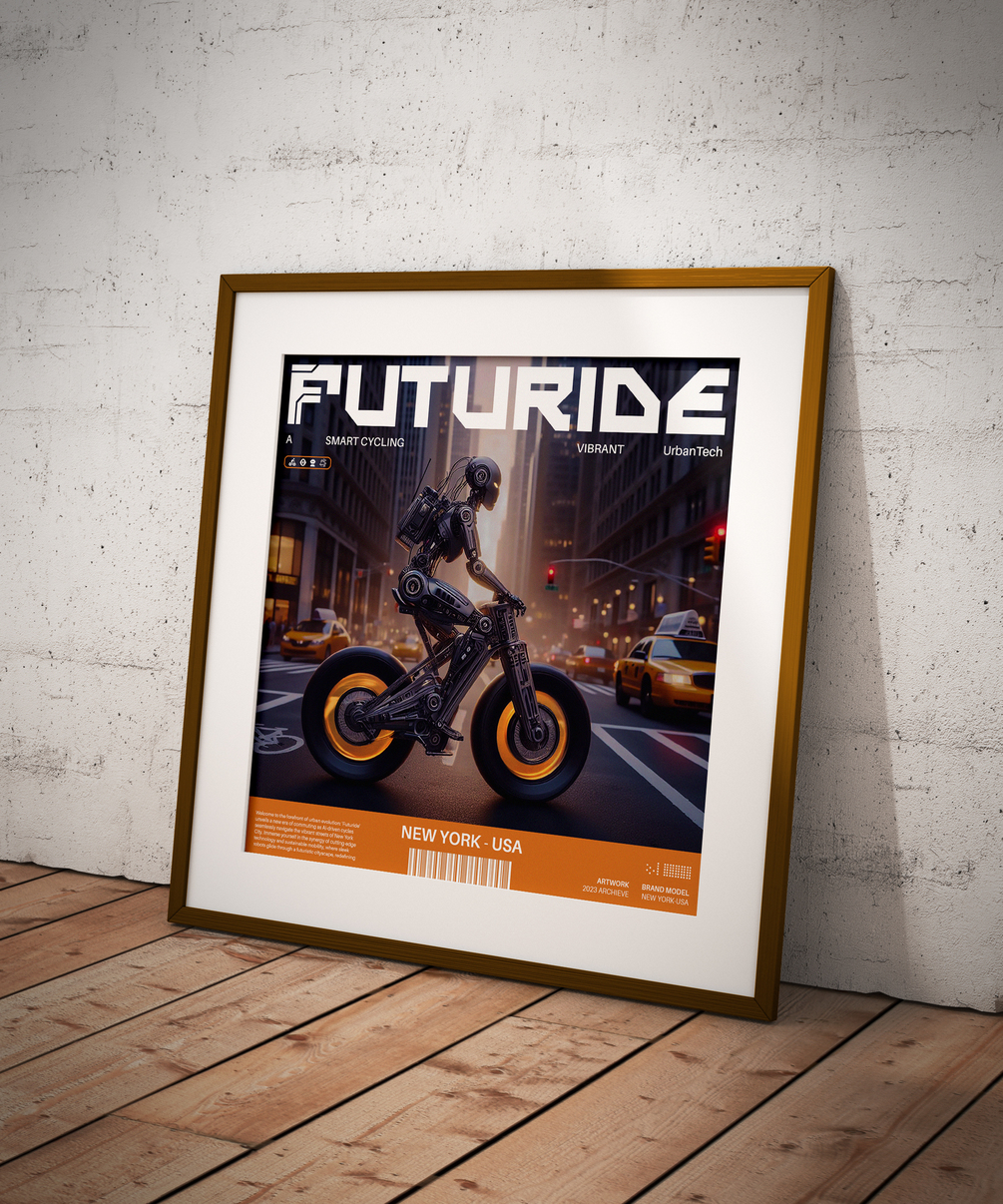 "Dive into the pulse of tomorrow's urban mobility with our electrifying 'Futuride' poster! Immerse yourself in the dynamic fusion of cutting-edge robotics and AI-driven cycling as sleek, tech-savvy bots pedal through NYC's bustling streets. Witness the synergy of innovation and sustainability captured in this eye-catching design, a vibrant tapestry weaving together the essence of AI-powered travel and futuristic urban landscapes. Join the ride toward a smarter, greener future today!"